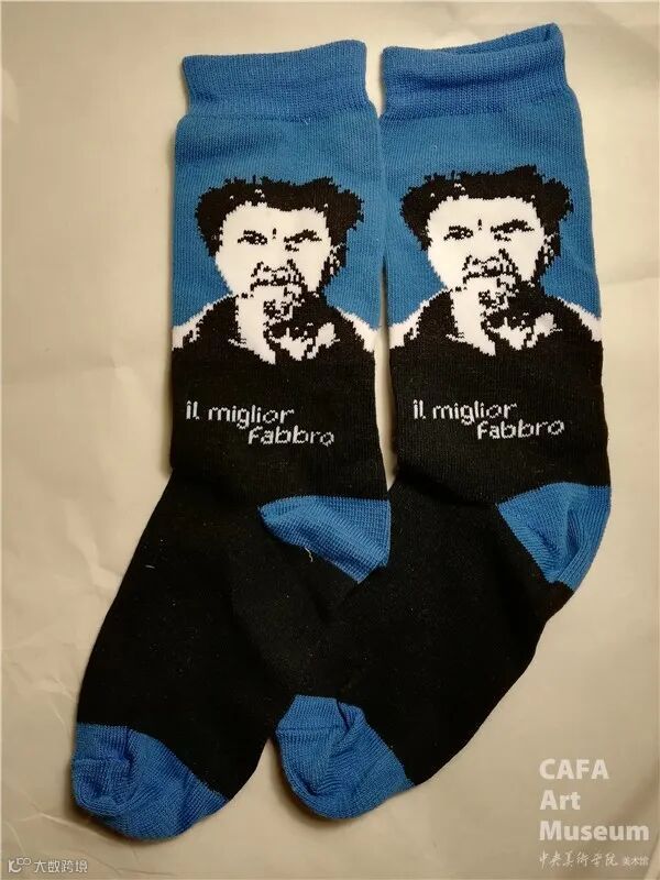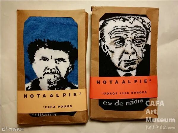 现在年轻人出的诗集都是这个,袜子上绣的是美国诗人埃兹拉·庞德。这俩老头一个是庞德,另外一个是博尔赫斯,博尔赫斯绣到袜子上了,年轻艺术家干这个,年轻的诗人。我在他们的小书摊上看到特别薄的书,我拿出来这是什么?这是乔伊斯的尤里西斯,我说不可能怎么这么薄,是那么厚的一本书,他们说用最能够找到最小的字印的一本尤里西斯,那就是一个艺术品,完全不认识,拿放大镜能够影影绰绰看到小字。人家是一大段,他就一行,缩成一行。我没拍下来有点儿遗憾。他一直做这种事情。