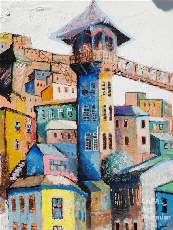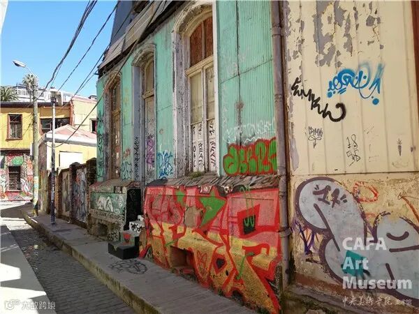 屏幕上看到的是智利的街景(破房子)。满大街的涂鸦,智利瓦尔帕莱索,是一个古城,大概是从我们的明代开始有的古城。这像是一幅美术作品,实际上是街上的涂鸦,是我拍的。望京这一带就有涂鸦,美术学院有一些学生出去在墙上画点儿涂鸦,人家的涂鸦画的比咱们功夫下的大多了。