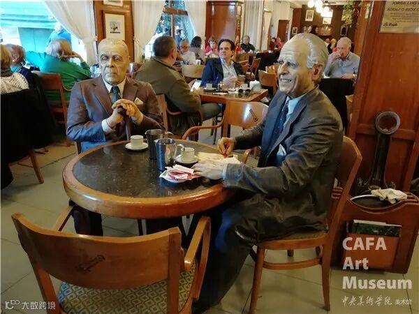 他们两个老在这个饭馆里吃饭,索性作为永久顾客雕塑在那儿,一进门就是他们俩,其他人在边上吃饭,他们俩一直在这儿聊着。博尔赫斯是阿根廷的一个骄傲,是布宜诺斯艾利斯象征性的人物。