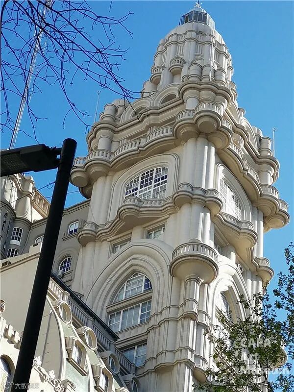 布宜诺斯艾利斯的一座大楼:Palacio Brolo大楼。这个楼是一个意大利人设计的,应该是19世纪20年代左右盖的一个楼,这个楼是根据意大利但丁的《神曲》盖的,神曲一共是100首歌,分地狱篇、炼狱篇和天堂篇。这座大楼30多层在地下属于地狱部分,30多层已经落到地上来了,是炼狱部分,再上面30多层属于天堂部分。特别有趣,我看到这个楼觉得太奇怪了,它曾经是南美的第一高楼,另外一个高楼是姊妹大厦在乌拉圭。但是乌拉圭我没有去过。《神曲》直接的一个视觉形象就是这个样子,我现在给大家展示的部分是天堂篇,难道天堂就是长这个样吗?而且是一个写字楼,但丁当年在写《神曲》的时候绝对不会想到这么一个人类历史上最伟大的文学作品变成了一个写字楼。但是我们能够感觉到拉美这一块的奇幻,满大街都是这种东西。