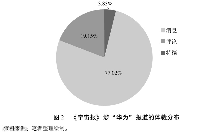 此外,笔者还将报道篇幅按500个词以下、500~1000个词、1000~1500个词以及1500个词以上为标准分为短篇、中篇、中长篇以及长篇四类,并对全部235个报道样本进行统计分析。结果显示,《宇宙报》涉“华为”报道以短篇为主(占比62.98%),中篇为辅(占比26.81%),中长篇(占比7.66%)和长篇(占比2.55%)报道较少。对相关报道的体裁考察发现,《宇宙报》涉“华为”报道的体裁类型相对比较单一,以消息为主,评论为辅,有少量的特稿。从图2可以看出,消息是涉“华为”报道中最主要的体裁类型,占比77.02%。这类体裁的报道文字简明扼要,篇幅短小,通常不会深入挖掘事件的根源及相关问题,但讲求信息的时效性与客观性,着重于及时、快速地发布和传播最新的事实。此外,值得注意的是,《宇宙报》中还有3.83%的报道以特稿为体裁,如《这就是深圳:诞生出华为的中国城市》《谁是孟晚舟?华为首席财务官被捕导致中美紧张局势加剧》《华为究竟是一家怎样的公司?华为为什么会卷入争端?》等,都是以较长篇幅,通过深入、详尽的叙事,将事态信息、情态信息、意态信息多层次地展现给读者。相较于消息类报道,新闻特稿更强调可读性和故事性,通常情况下,作为特稿的题材需要在热点、深度、争议、关切等方面具有较高的新闻价值。《宇宙报》以文学性较强的特稿形式对华为进行深度报道,一方面反映出华为是热点事件,在墨西哥乃至整个拉美地区具有一定的影响力,能够满足读者的求知欲和好奇心;另一方面,也说明墨西哥乃至拉美舆论在华为问题上的立场和态度并没有“一边倒”,能够引发公众的广泛讨论。