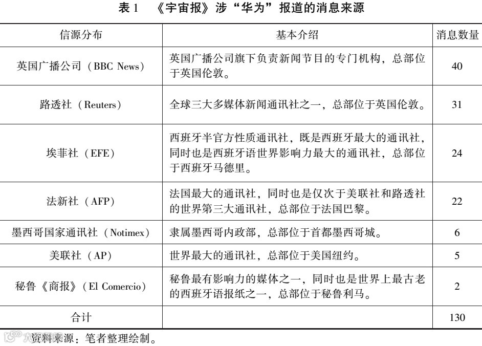 从信源分布上来看,《宇宙报》涉“华为”报道的消息来源以外媒为主,尤以英国媒体为甚,这在一定程度上表明墨西哥媒体在华为问题上与英方立场有所趋同。“拉美文化本质上是在其殖民历史过程中形成的一种独特的、西方文化占据主导地位的混合文化,或者说,拉美是一个主要受西方思想和价值观主导的地区。”“由于长期受到西方媒体的深刻影响甚至支配,拉美媒体总体上对西方媒体存在着信源依附。”事实上,表1的数据也充分地反映出这一特征,《宇宙报》有关“华为”的新闻报道中有130条来自以西欧和美国为主的“始终的新闻制造者”,占全部样本数量的55.32%。