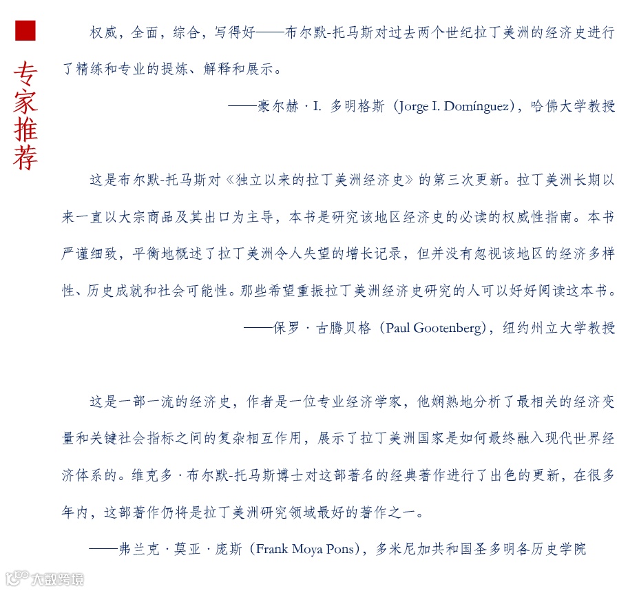 维克托·布尔默—托马斯从交叉学科的视角,运用经济学和历史学的理论对拉美独立以来的发展进程进行综合分析,全面总结了这个地区将近200年经济增长的成就和不足,在增长模式、经济结构、殖民地遗产、外部冲击、制度变迁、公共政策以及经济史分期等一系列焦点和难点问题上,观点鲜明,思路清晰,不乏独到新颖而令人折服的见解,故而经得起时间的磨砺。