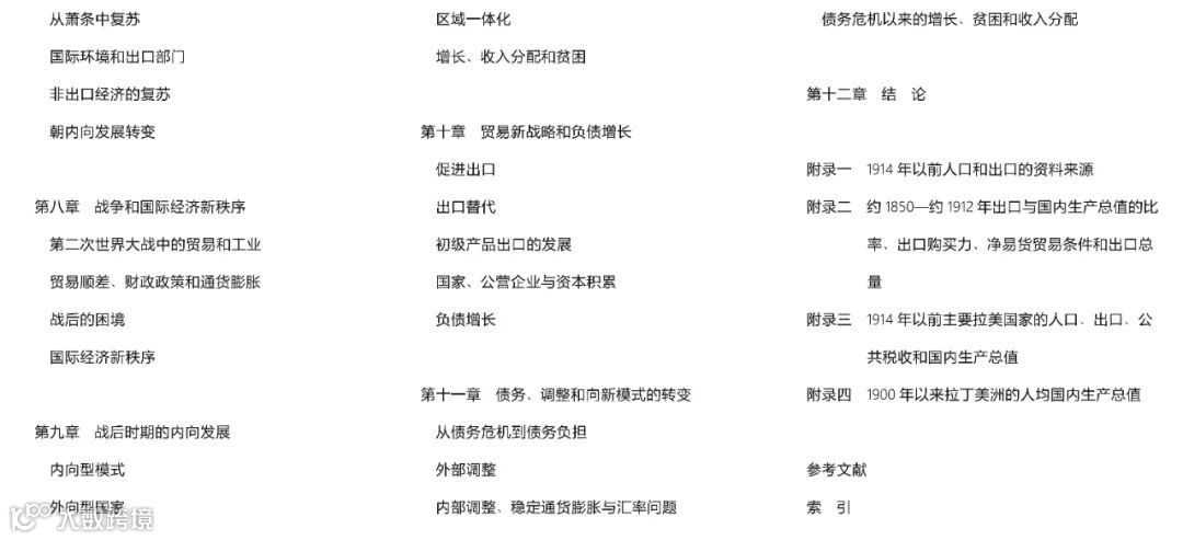第一,作者重申了第一版的基本论点,只是语句表达上有所变动。作者认为,拉美独立后的经济史可分为三个阶段。第一阶段是以初级产品为基础的传统出口导向阶段,20世纪第二个10年达到顶峰,大萧条之后逐渐败落。第二阶段为内向发展阶段,以19世纪末一些大国率先开始的进口替代为基础,高峰期是二战后的25年,直至1980年初彻底失败。前两个阶段的划分虽是明确的但又是互相交叉的阶段。第三阶段实际上起于20世纪60年代末,一些国家开始从内向型发展模式转向一种基于非传统出口(包括制成品)以与世界经济融为一体的新型模式。20世纪80年代和20世纪90年代这一进程加速发展,到21世纪初,整个拉美都进入了一个出口导向增长的新时代。诚然,各国进入不同阶段的时间是不一致的。尽管几个拉美大国从20世纪30年代至20世纪80年代初期通过由出口导向增长转为内向型发展模式,获得了一定的成果,但因其未能改变在收入分配中所存在的严重不公平现象,最后都失败了。商品机遇性、出口导向增长机制和经济政策环境三者协调是否得当,一直是作者分析拉美经济发展成败得失的出发点和落脚点。作者断言:没有一种理论能够单独解释,为什么拉丁美洲在世界人均收入上至今仍处于中等地位,以及拉丁美洲各国随着时间的推移而呈现出诸多的差异性。作者的这些基本观点在第三版的各章中有充分的阐述。