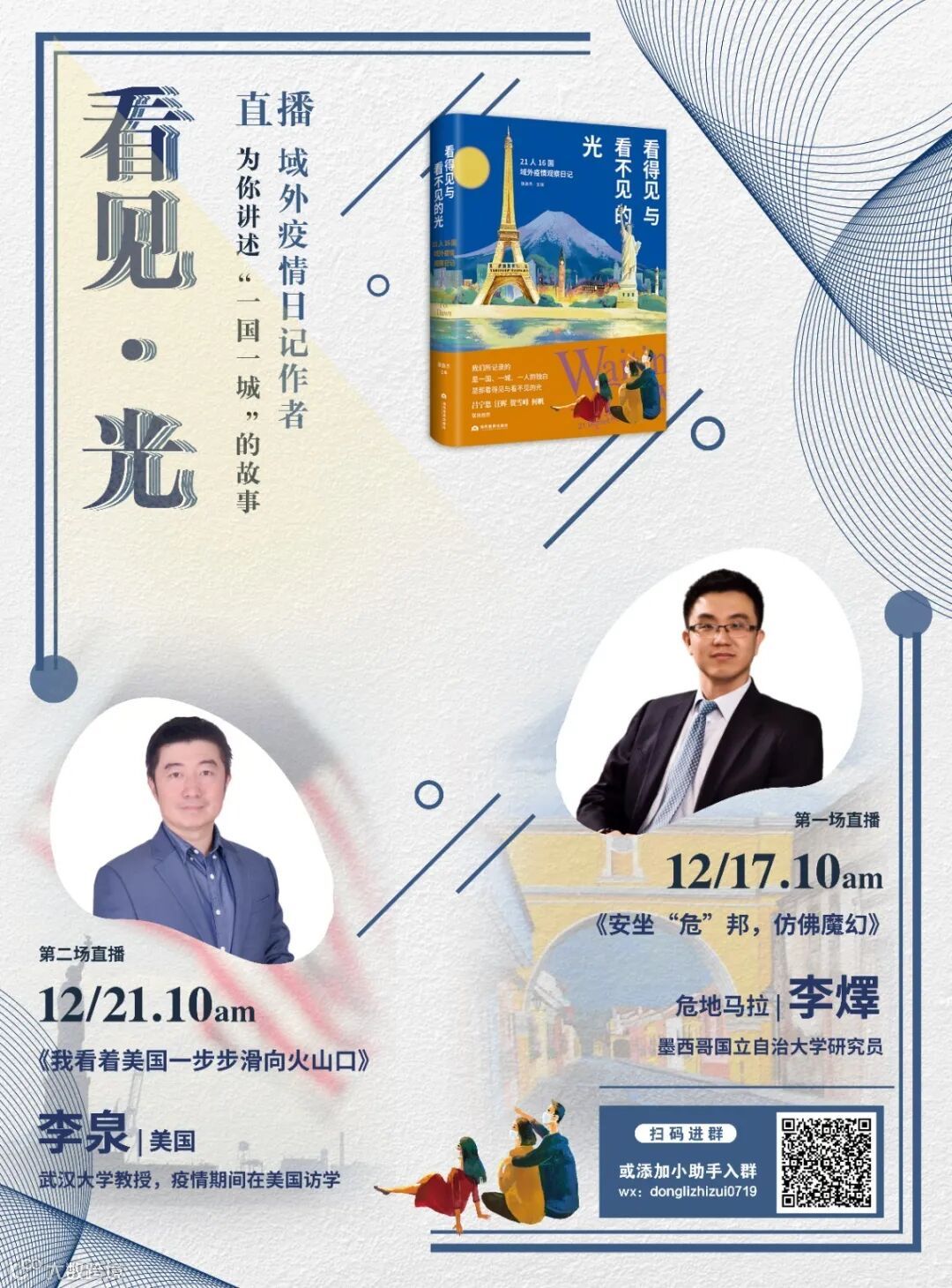 “看见·光”的直播计划起源于一本书,名为《看得见与看不见的光:21人16国域外疫情观察日记》。