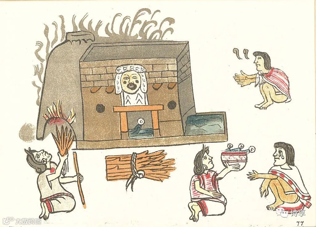 此外,更为重要的是,蒸房可以看作一个温暖湿润的洞穴,与怀孕生产的女性生殖器——阴道及子宫具有土著宗教意义上的象征关系。女子在临产和生产后的“药蒸”也在蒸房完成。“母亲神”Tlazolteotl也是蒸房的掌管者。由此看来,蒸房是阿兹特克人精神传统上很好的受孕地点。
