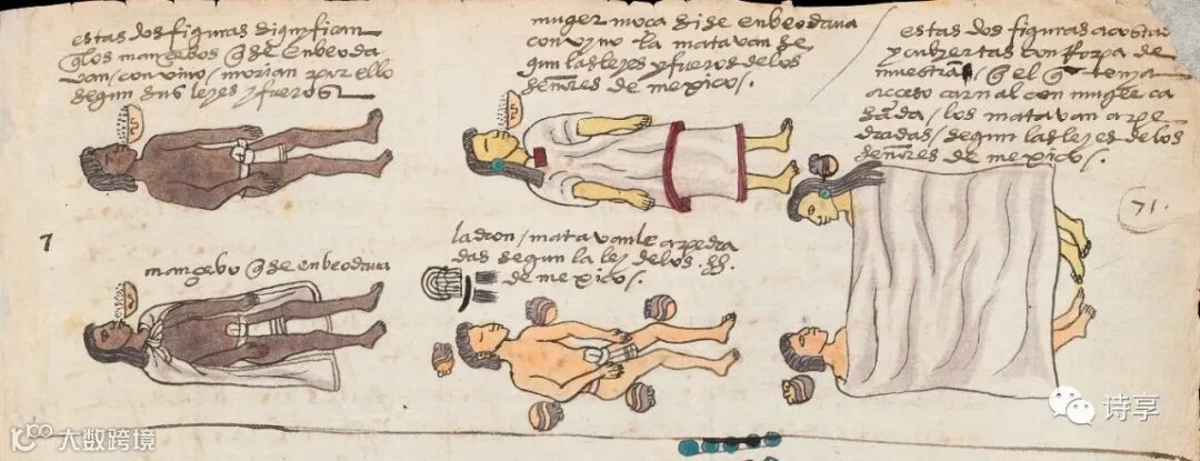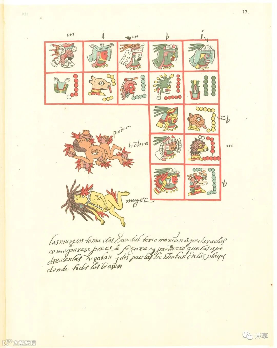 翻译:“这两个盖着衣服躺在一起的人表示,男的和结了婚的女子发生肉体关系。根据阿兹特克王国领主贵族们的律法,人们用乱石砸死他们。”
