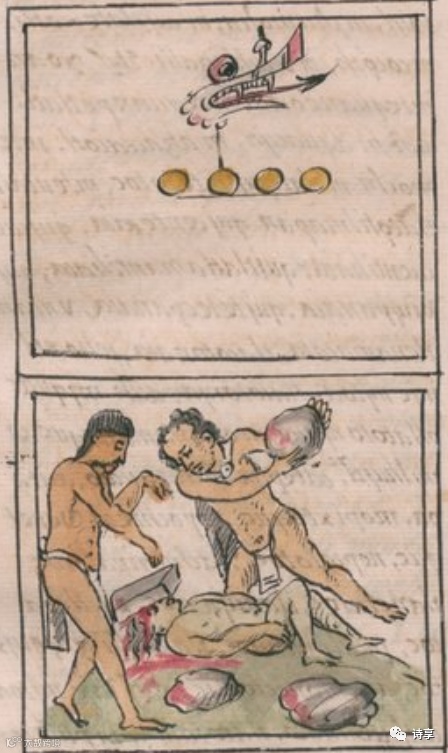 说到“丰饶”,阿兹特克民族的世界观中有将人的鲜血与男性的精液联系在一起的思想。前者在宗教中具有滋养土地,让大地变得肥沃的作用,而后者在生理上的功能不言而喻。因此,我们可以看到在《劳德手抄本》中,有一幅“砍头祭祀”的图,其中一人手持自己砍下的头,鲜血从颈部涌出,而与之呼应的就是下半身的阴茎。