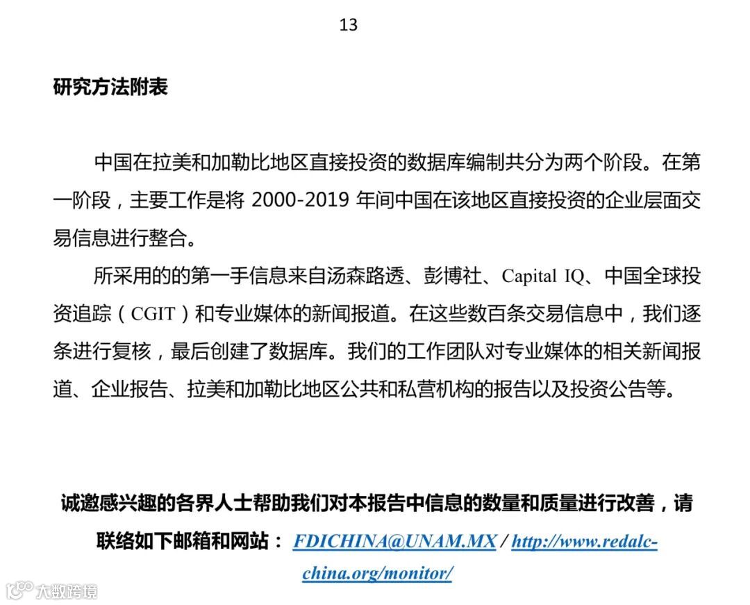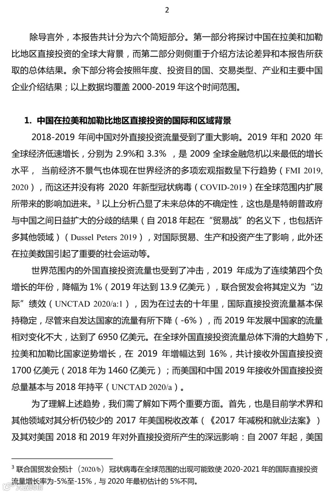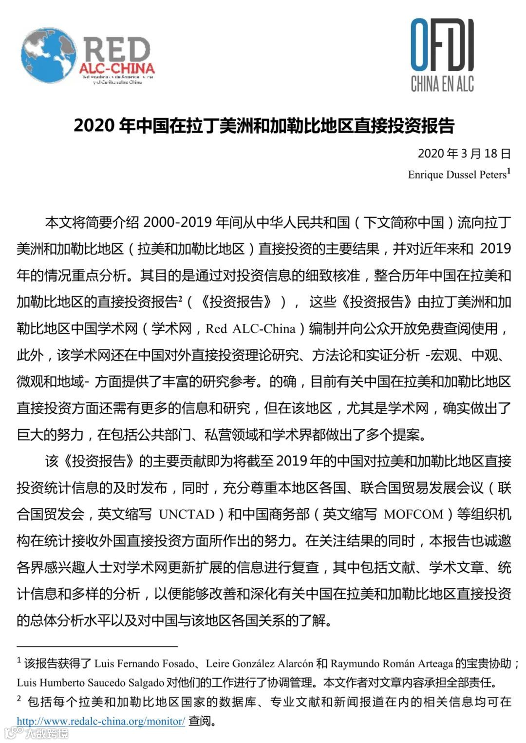 由拉丁美洲和加勒比地区中国学术网(Red ALC-China)编制并向公众开放的《2020年中国在拉丁美洲和加勒比地区直接投资报告》(下称《报告》)近日出炉。中拉智讯特转载以飨读者。《报告》简要介绍了2000~2019年间从中国流向拉丁美洲和加勒比地区(下称拉美)直接投资的主要结果,并对近年来和2019年的情况进行重点分析,目的是通过对投资信息的细致核准,整合历年中国在拉美的直接投资情况。除导言外,本报告共分六部分:第一部分探讨中国在拉美直接投资的全球大背景,第二部分介绍方法论差异和本报告所获取的总体结果,余下部分按年度、投资目的国、交易类型、产业和主要中国企业分别介绍投资结果。