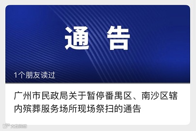 近日,番禺区、南沙区发生本土疫情。根据疫情防控有关规定,自4月1日起,番禺区、南沙区辖内的殡仪馆、公墓、骨灰楼(堂)等殡葬服务机构暂停现场祭扫活动,恢复时间另行通知。有关事项通告如下: