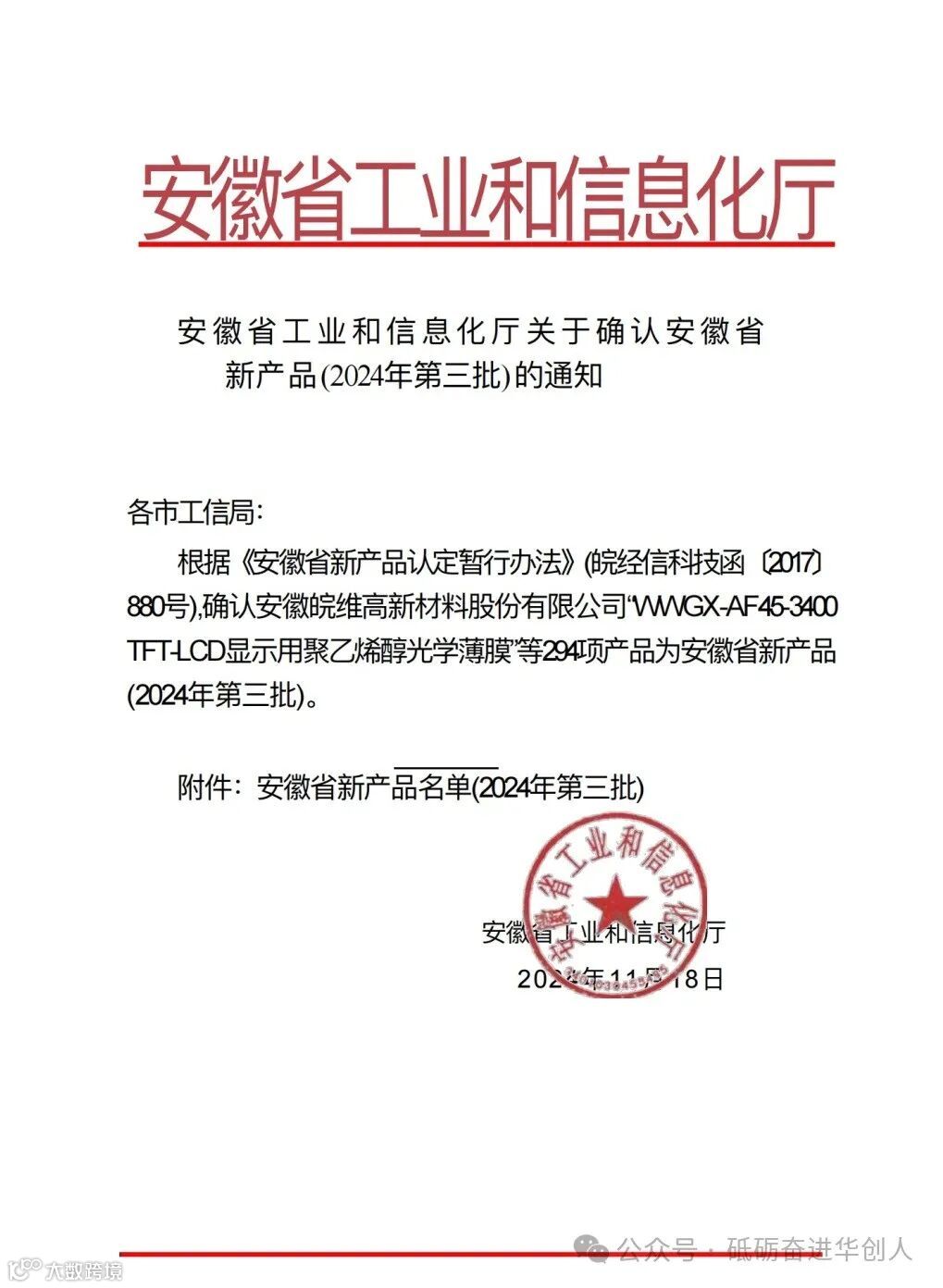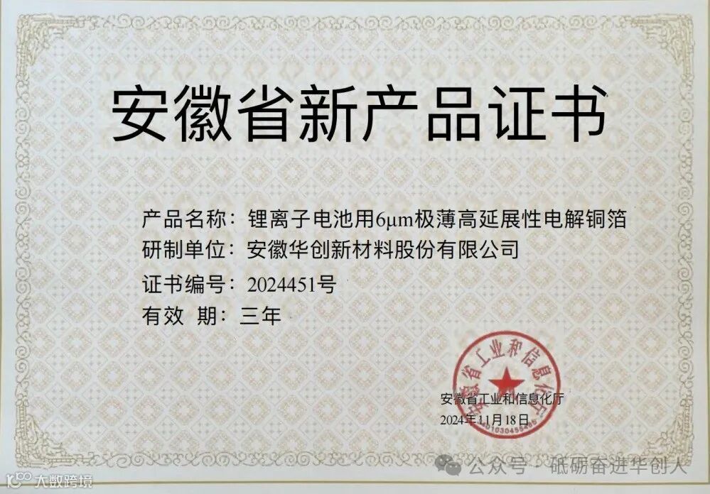 华创新材荣获2024年安徽省新产品认定证书