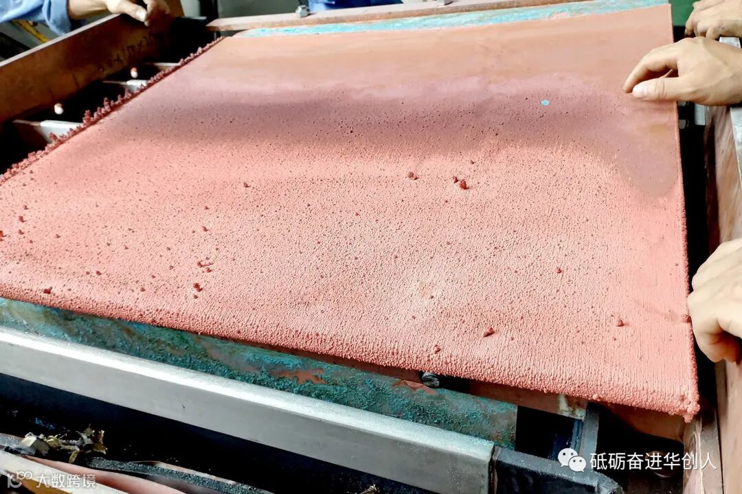说干就干!项目组成员经过精心策划与充分准备,拟定了自研自制设备的分阶段实施计划,各成员利用业余时间,主动加班推进项目执行——从电解槽槽体的制作,到工艺管道、整流电源就位安装,再到阳极板及负极铜板的安装……两个月的时间里,历经无数次的试验和修改,终于在8月27日,将整套设备从设计图纸变成了安装在水处理车间的实物。经过38小时试运行,8月30日上午,在这套华创人自研自制的设备上,第一槽重达142公斤的电解阴极铜板成功下线。