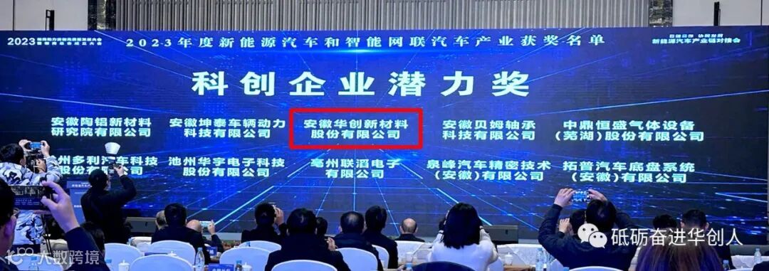 12月20日下午,安徽新能源汽车产业链对接会在安徽合肥召开。大会发布了2023年度新能源汽车和智能网联汽车产业获奖名单,安徽华创新材料股份有限公司荣获“科创企业潜力奖”。