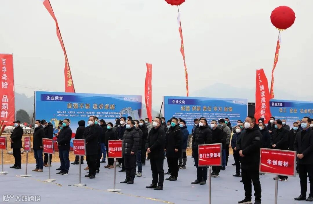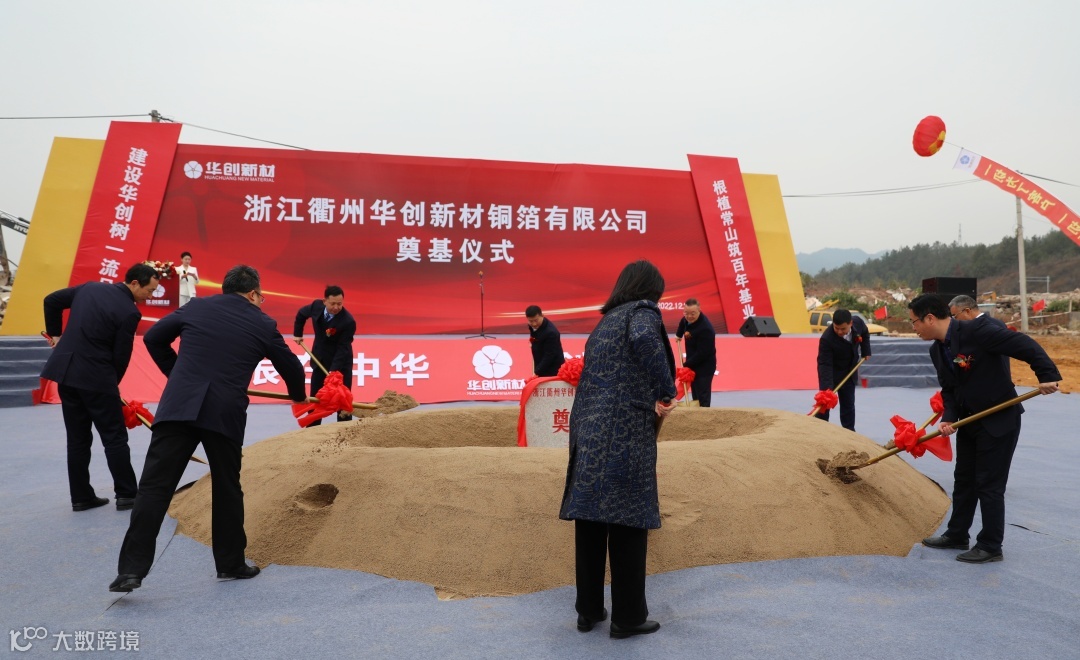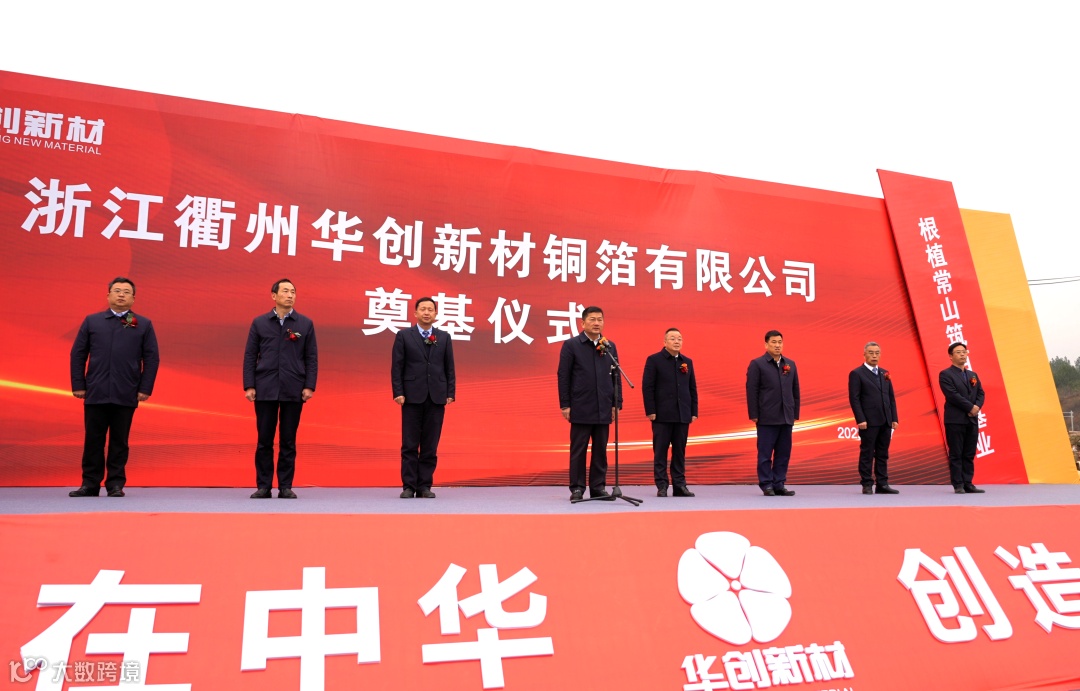 12月27日上午,浙江衢州华创新材铜箔有限公司年产10万吨高性能铜箔项目奠基仪式在浙江衢州华创铜箔项目地举行。衢州市委常委、常务副市长周向军,衢州市人大常委会副主任、常山县委书记潘晓辉,常山县委副书记、县长王永明,常山县政协主席许茂华,常山县委常委、常务副县长许露华,常山县委常委、辉埠镇常委书记杨力军,常山县人大党组副书记、副主任何健,华创新材董事长兼总经理周盛夫,华创新材经营班子成员共同出席仪式。