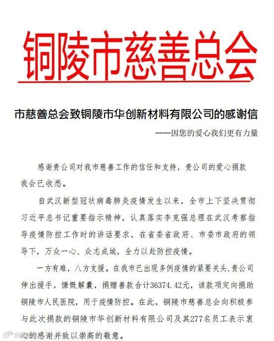 2月4日至13日期间我司开展“携手同心 共战疫情”专项募捐的倡议书,截止13日共计收到华创全体干部员工爱心捐款36374.42元。2月15日捐于铜陵市慈善总会,定向捐给铜陵市人民医院,用于疫情防控。铜陵市慈善总会向我司及其277名员工表示衷心的感谢和崇高的敬意。奋战一线的医护人员你们辛苦了,向你们致敬,加油!