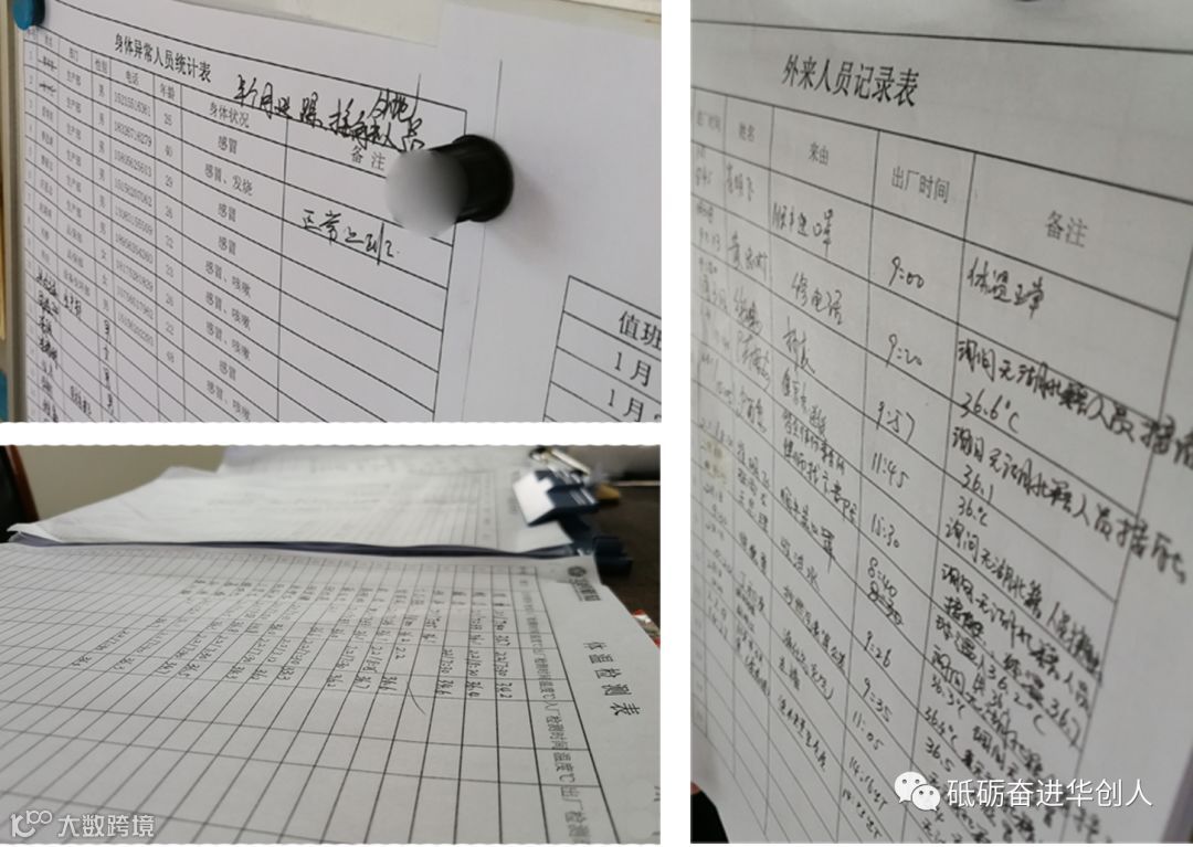 除此之外,门卫室的办公桌上还摞着一沓沓登记表——《体温检测表》《外来人员记录表》《员工外出铜陵记录表》……每一份表格上都记录着与之相对应的详细信息。