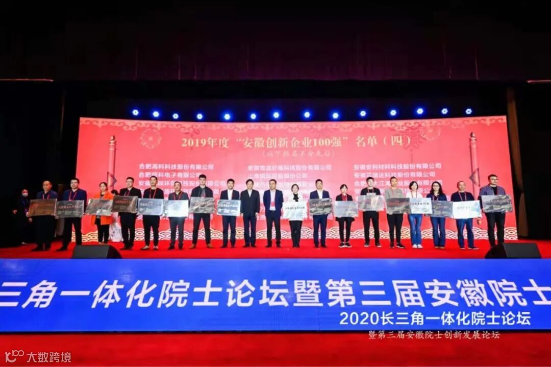11月7日,由安徽省经济和信息化厅、安徽省科技厅等指导,安徽省科学家企业家协会、中科院合肥技术创新工程院等主办,安徽创新企业100强组委会承办的“2020长三角一体化院士创新发展论坛暨安徽创新企业100强颁奖典礼”在合肥稻香楼宾馆举行。颁奖典礼上,我公司荣获2019年度“安徽创新企业100强”称号。