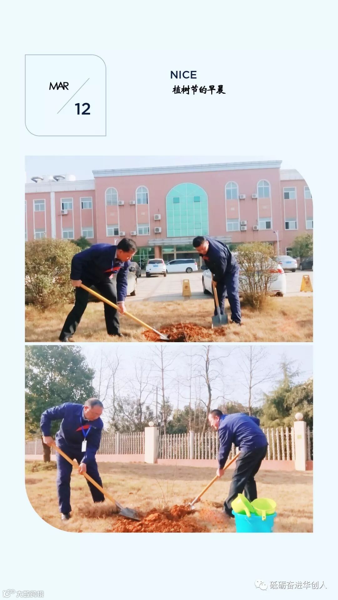 在植树现场,大家拿起铁锹和锄头开始埋头植树。大家互相配合,有的挥锹铲土 ,有的扶树填土,有的培土浇水,忙的不亦乐乎。经过一段时间的劳动,几颗梅花树在绿化带里“安家落户”,为厂区增添一抹新绿。