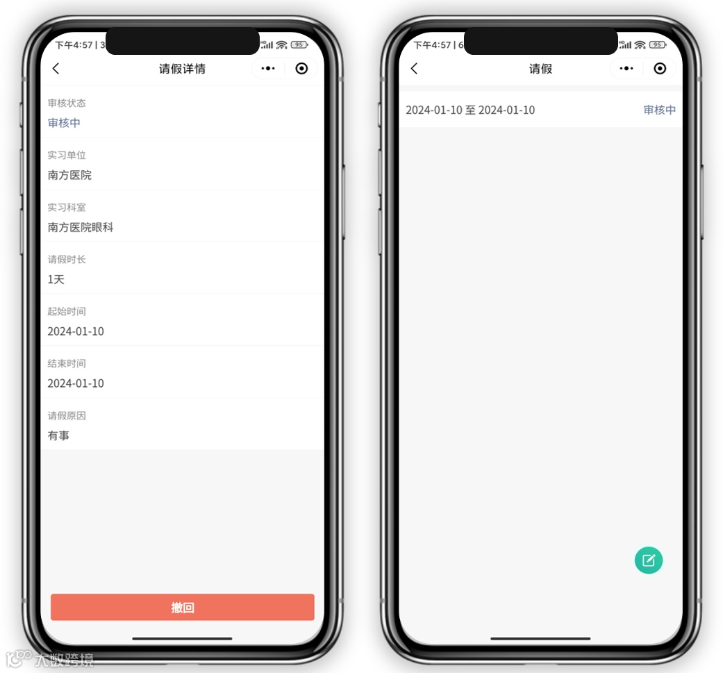 签到分为四种状态用不同颜色代表,同时可实现多院区定位设置,方便实习生按实际轮转情况签到。