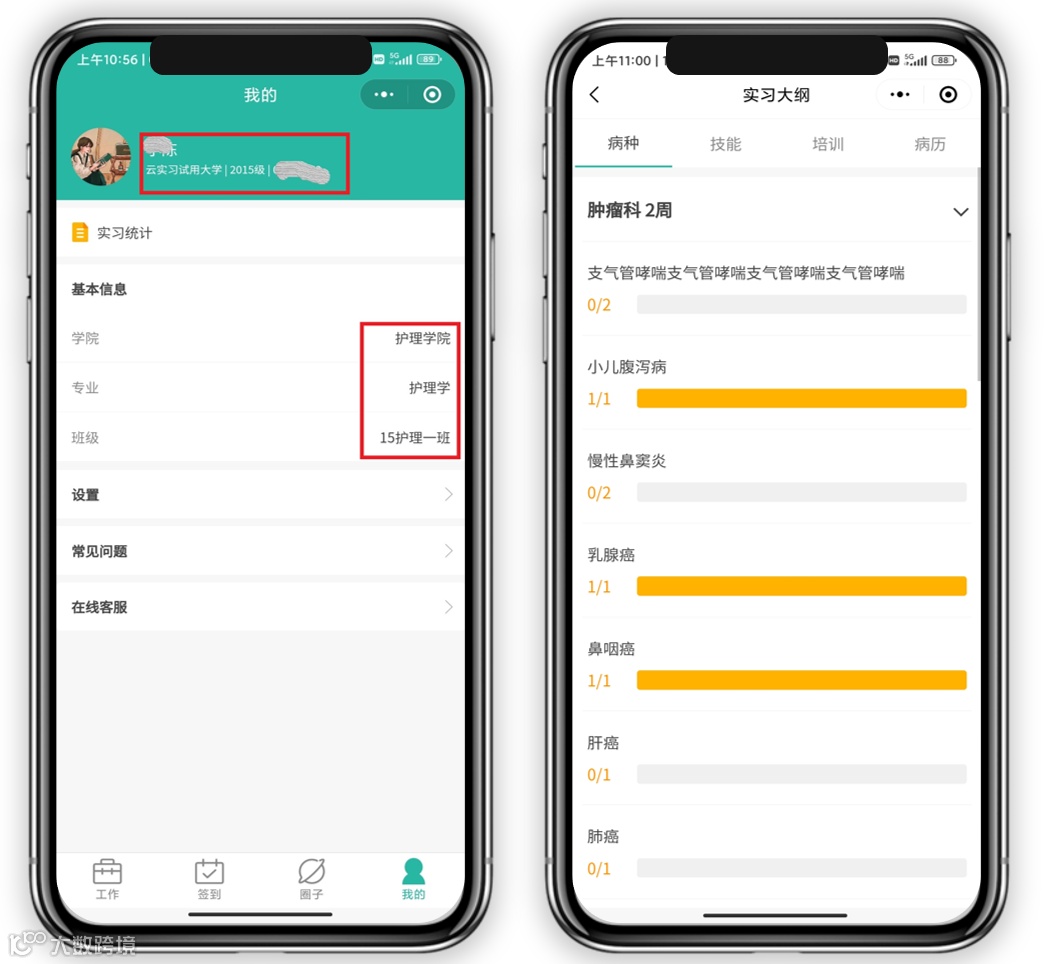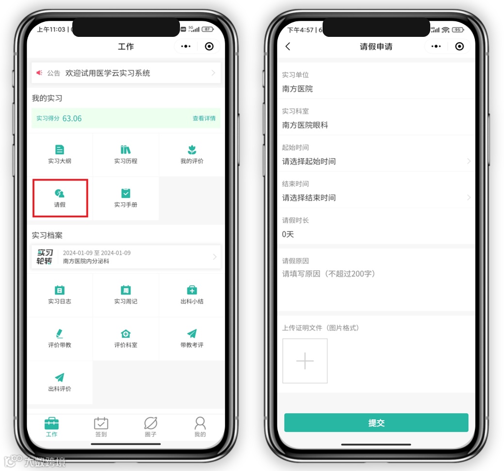 实习得分、实习大纲、实习历程、我的评价、请假、实习手册