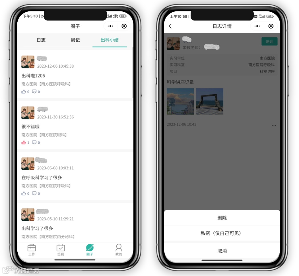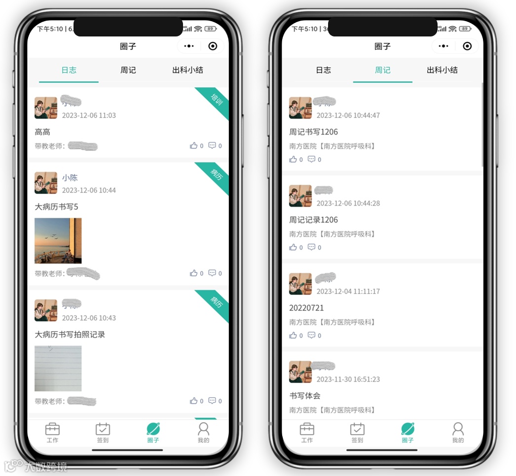 “圈子”功能给实习生提供一个相互学习、互动的平台,同时配备对圈子内容管理功能。