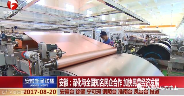 2017年8月20日安徽卫视新闻联播头条报道:华创新材作为国内知名企业投资入驻安徽的成功典范,是铜陵市铜基新材料产业集聚发展基地的骨干企业,更是一个资源节约、环境友好、技术领先的新材料制造项目。
