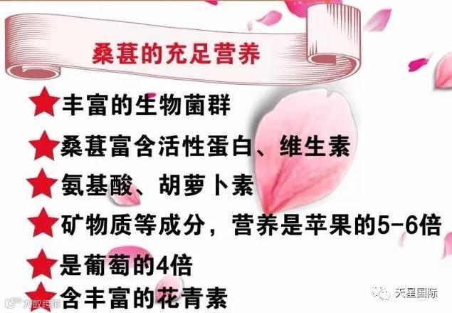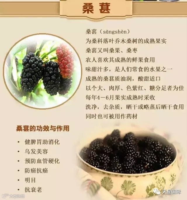 它含有丰富的活性蛋白、维生素、氨基酸、胡萝卜素、矿物素等成分,具有多种功效,被医学界誉为“二十一世纪的最佳保健果品”。常吃桑葚能显著提高人体免疫力,具有延缓衰老,美容养颜的功效。