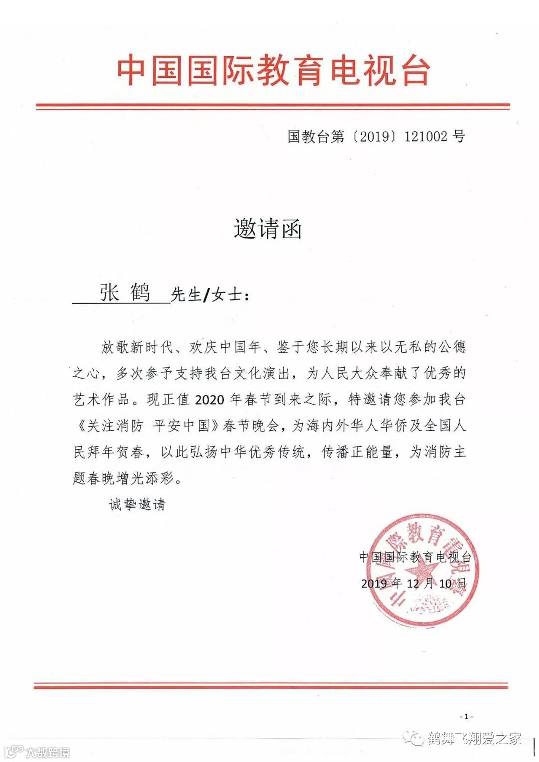 张鹤受邀参加【中国国际教育电视台】《关注消防平安中国》春节晚会。