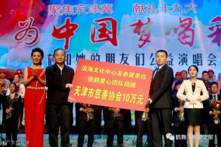 2017年10月6日、7日“为中国梦喝彩”——张鹤和她的朋友们公益演唱会在天津滨海演艺中心歌剧厅隆重上演。演出现场,滨海文化中心及参建单位的广大职工和张鹤爱心团队的朋友们将自己的爱心汇聚在一起,向天津市慈善协会鹤舞飞翔慈善基金捐赠10万元善款,专项用于救助孤儿和孤老。