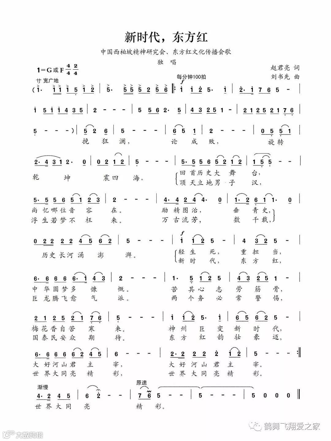 《新时代,东方红》是中国西柏坡精神研究会与东方红文化传播的会歌,宗旨是弘扬主旋律、传播正能量,由中国西柏坡精神研究会筹委会秘书长兼东方红慈善公益基金秘书长赵君亮作词,著名作曲家刘书先作曲,“挽狂澜,论成败,旋转乾坤,震四海……新时代,东方红,巨龙腾飞愈气派,两个务必常警惕,国泰民安众期待……”著名歌唱家张鹤的真情演绎,用大气优美的歌声为新时代喝彩祝福,“东方红、我代言、我奉献、我快乐!”