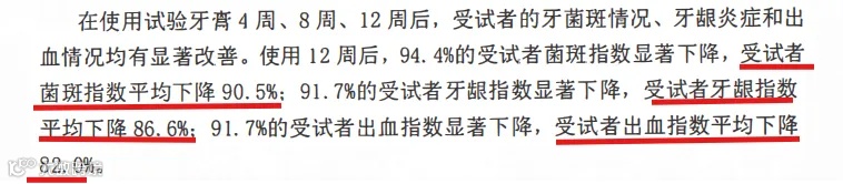 临床报告显示:使用12周后,受试者菌斑指数平均下降90.5%;出血指数平均下降82.0%,牙龈指数(即牙龈问题)平均下降86.6%。这效果,显著超过市面上同类产品。