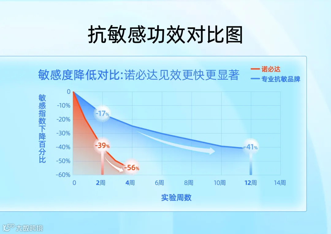 也许大家对上面数据没什么概念。同样,我们跟某知名专业抗敏牙膏的临床数据进行对比,就可以非常直观地看出,诺必达牙膏抗敏感效果有多么显著!