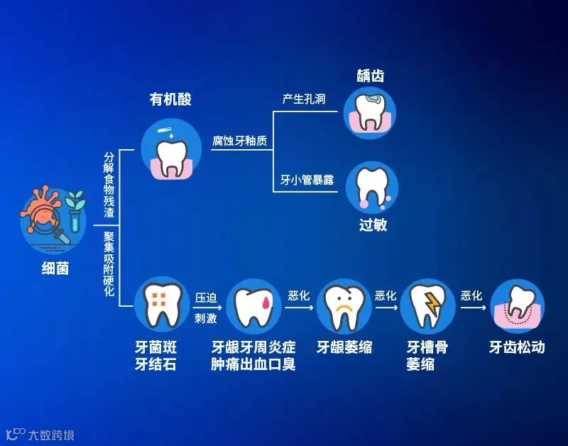 口腔问题虽然各种各样,但主要根源就在于牙菌斑牙结石滋生和牙釉质受损。