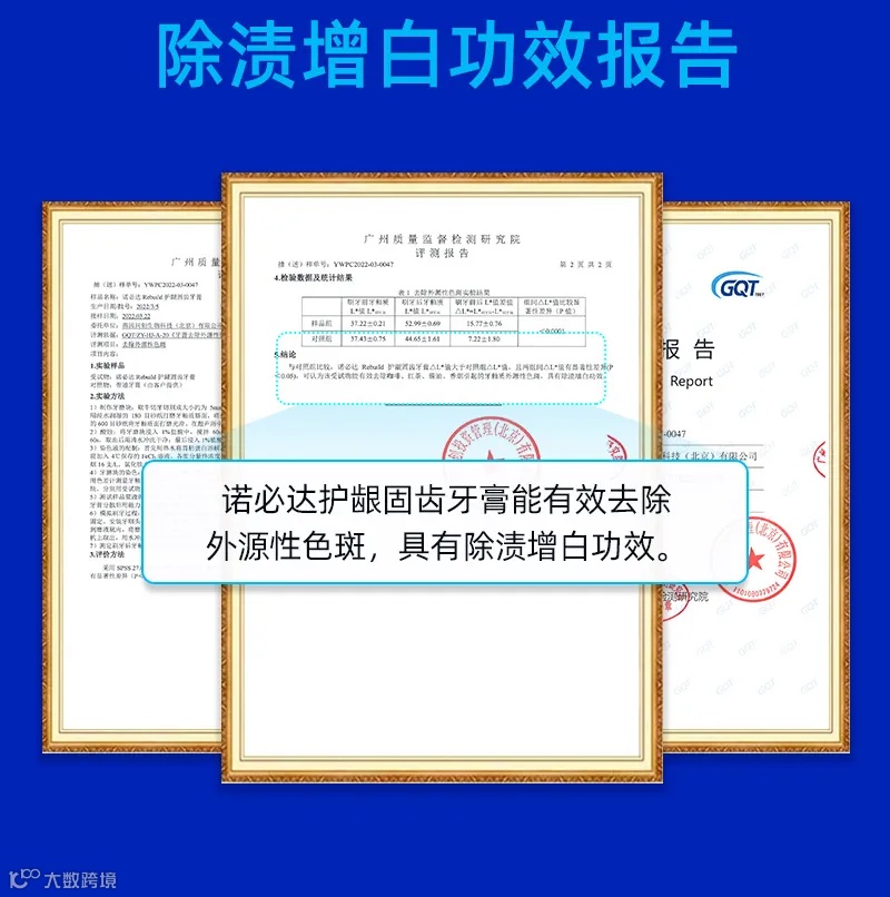同时,经第三方检测实验室验证,诺必达护龈固齿牙膏能够去除茶渍、烟渍、咖啡渍等,具有除渍增白功效;抑菌率高达99.9%,具有抑制口臭、清新口气功效。