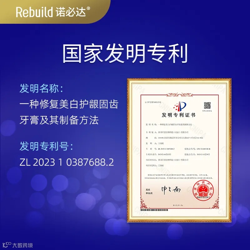 诺必达护龈固齿牙膏由北大博士科研团队研发,其配方和制备方法:一种修复美白护龈固齿牙膏及制备方法,获得了国家发明专利认证保护。