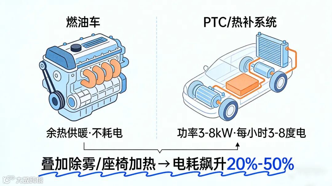 燃油车可依靠发动机余热供暖,几乎不额外耗电,但新能源车的制热完全依赖PTC加热器或热泵系统,其功率高达3-8kW,开启一小时就会消耗3-8度电。若再叠加前挡风除雾、座椅加热等常用功能,车辆整体电耗会直接飙升20%-50%。
