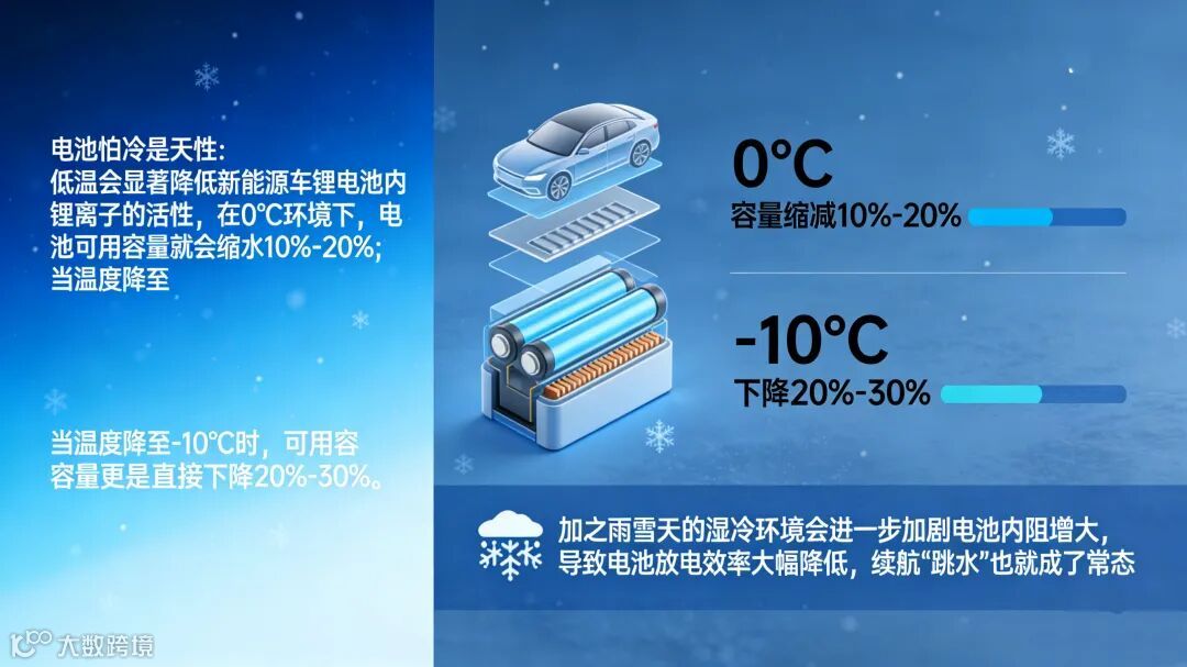 低温会显著降低锂电池内锂离子的活性,在0℃环境下,电池可用容量就会缩水10%-20%;当温度降至-10℃时,可用容量更是直接下降20%-30%。加之雨雪天的湿冷环境会进一步加剧电池内阻增大,导致电池放电效率大幅降低,续航“跳水”也就成了常态。