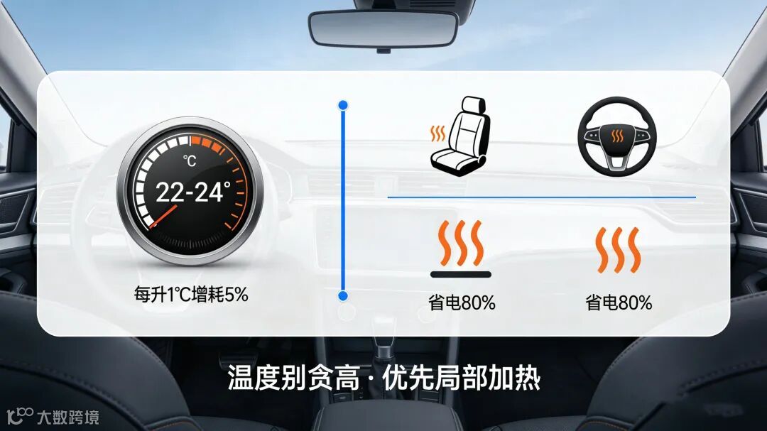 优先局部加热:优先开启座椅加热+方向盘加热功能,相比开启整车暖风可省电80%,既能快速暖身,又能大幅降低电耗。