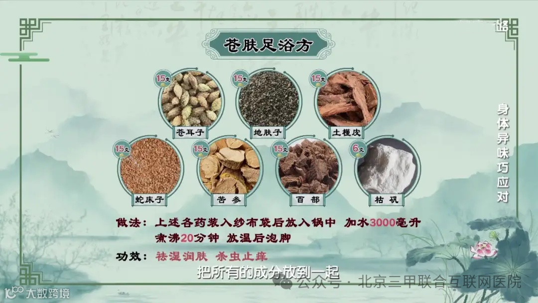 1.苍肤洗剂:苍耳子、地肤子、土槿皮、苦参、蛇床子、百部各15g,枯矾6g,以上药物用时用布袋装好后加水2000ml,煎煮20min,待温后浸泡20分钟,日1~2次。治以清热燥湿,润肤止痒为主。