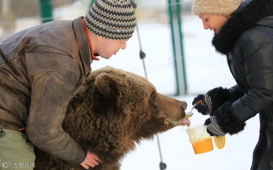 请问图中的俄罗斯人正在用什么喂熊?