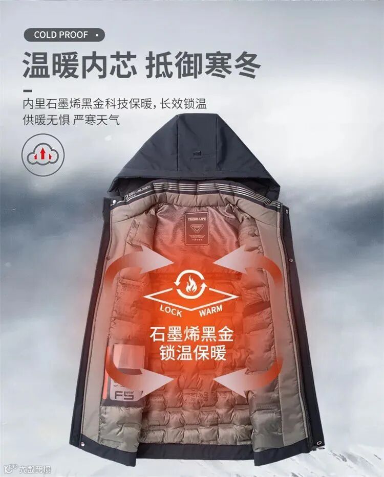推荐理由:以石墨烯科技为灵魂,将为你御寒保暖。三层隔固聚暖锁温设计,让寒冷再也无法触摸你的肌肤。贴心设计考虑到各种户外活动需求,灵活而温馨。在这个寒冷的季节里,有他笑对寒风~
