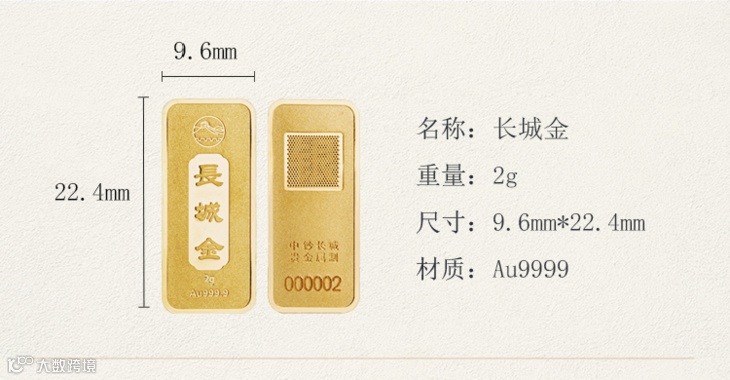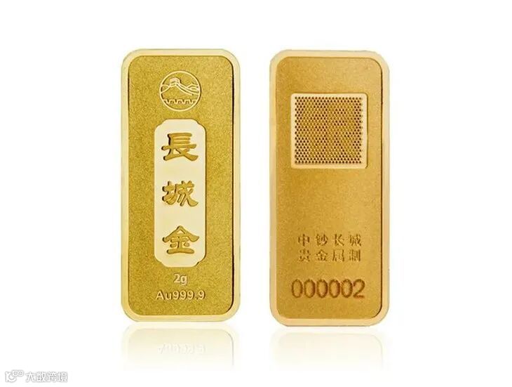 2克金条正面图案为万里长城、“长城金”字样,还标有金条的克重及成色;背面刻有“中钞长城贵金属制”字样,以表明其权威性。