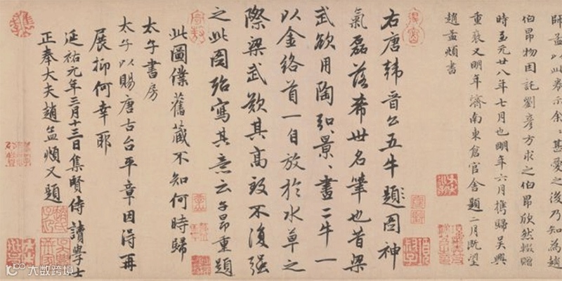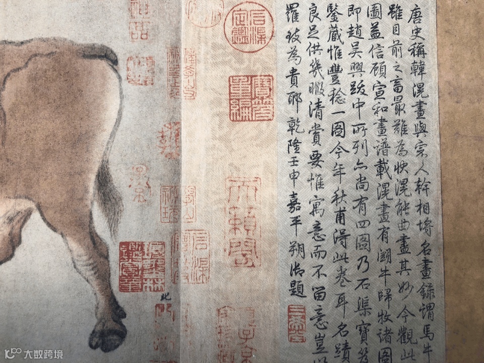 它是唐代画家、宰相韩滉的传世孤本,创作至今1200年,有赵孟頫、孙弘、项元汴、弘历、金农等十四家题记。