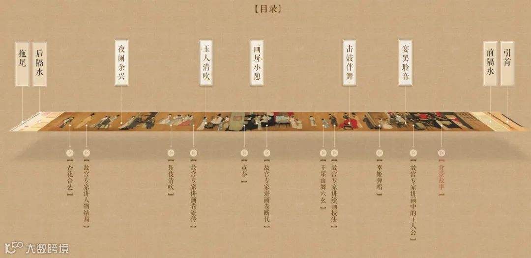全图共分为5段。首段“听乐”,第二段“观舞”,第三段“暂歇”,第四段“清吹”,第五段“散宴”。细致地还原了宴会上弹丝吹竹、清歌艳舞、主客揉杂、调笑欢乐的热闹场面。