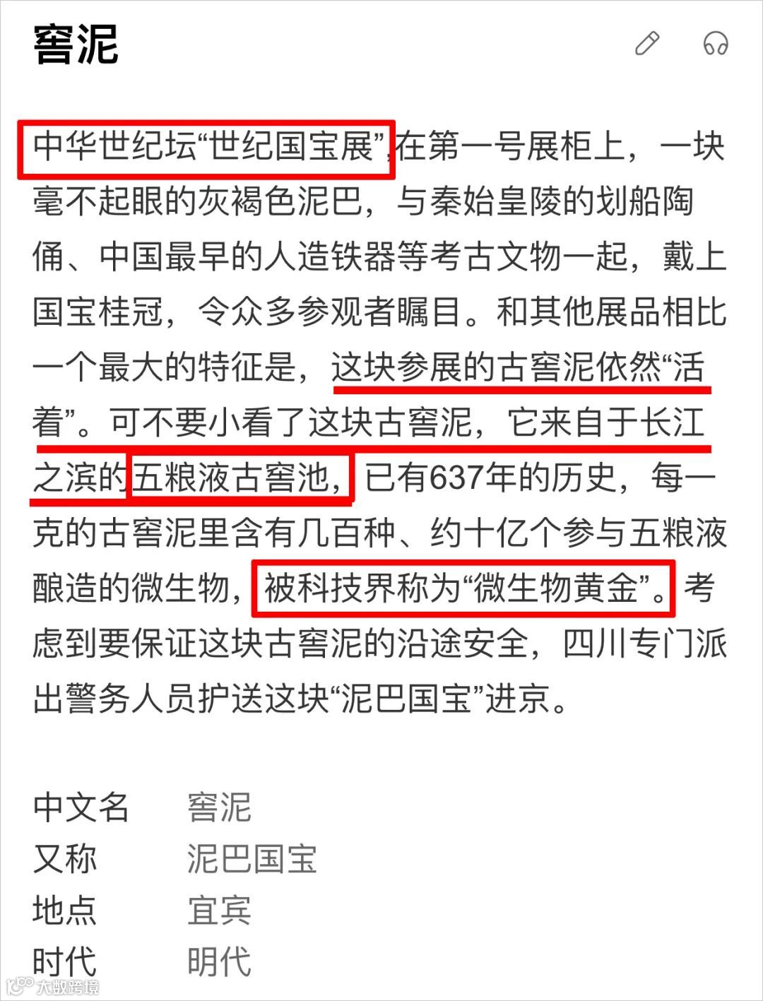 2005年,五粮液的明代地穴式曲酒发酵窖一块637岁的古窖泥,被中国国家博物馆永久收藏,被亲切的称为“泥巴国宝” 。