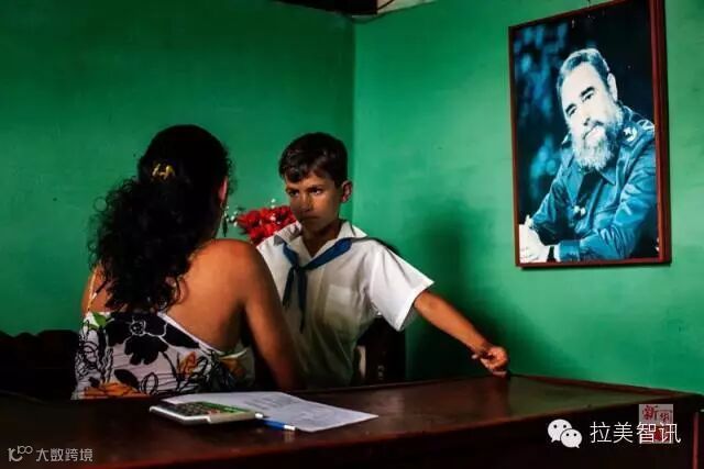 ↑2014年2月25日,在古巴烟草主产区比纳德里奥省的一所烟厂,还未下班的母亲正在询问放学归来孩子当天的课业。