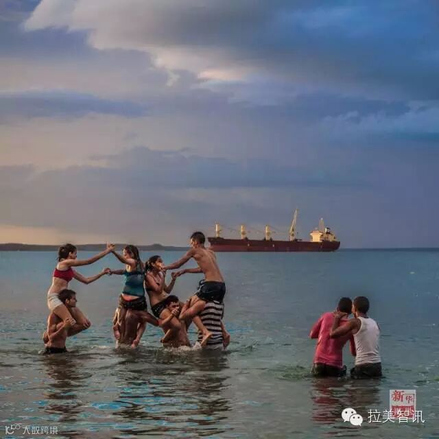↑2014年2月3日,古巴西恩富戈斯市海湾里,青年们在浅水中“骑马打仗”。
