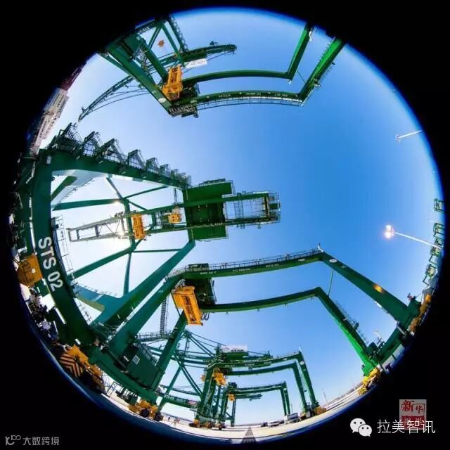 ↑2014年1月27日,鱼眼镜头拍摄的古巴首个经济特区——马里埃尔港码头一期工程塔吊。