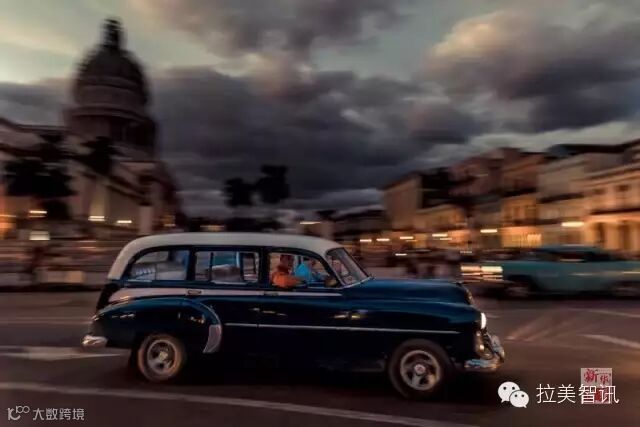 ↑2014年10月25日,一辆作出租车用途的老爷车驶过哈瓦那老城区,夕阳灯影中,不知今夕何夕。