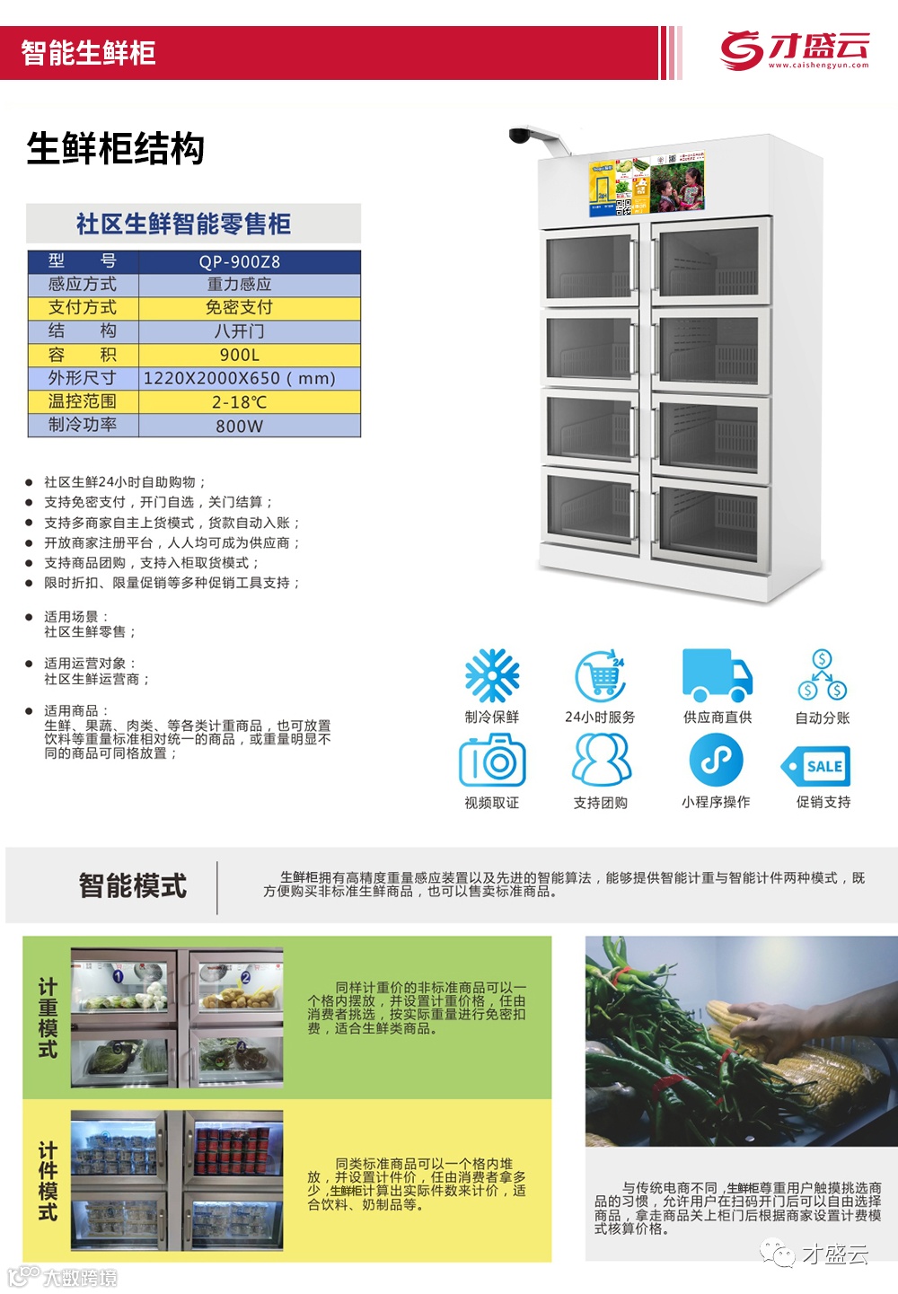 硬件:生鲜柜,一组8格,每格独立温控,自动计量。随时随地、新鲜便捷看得见。